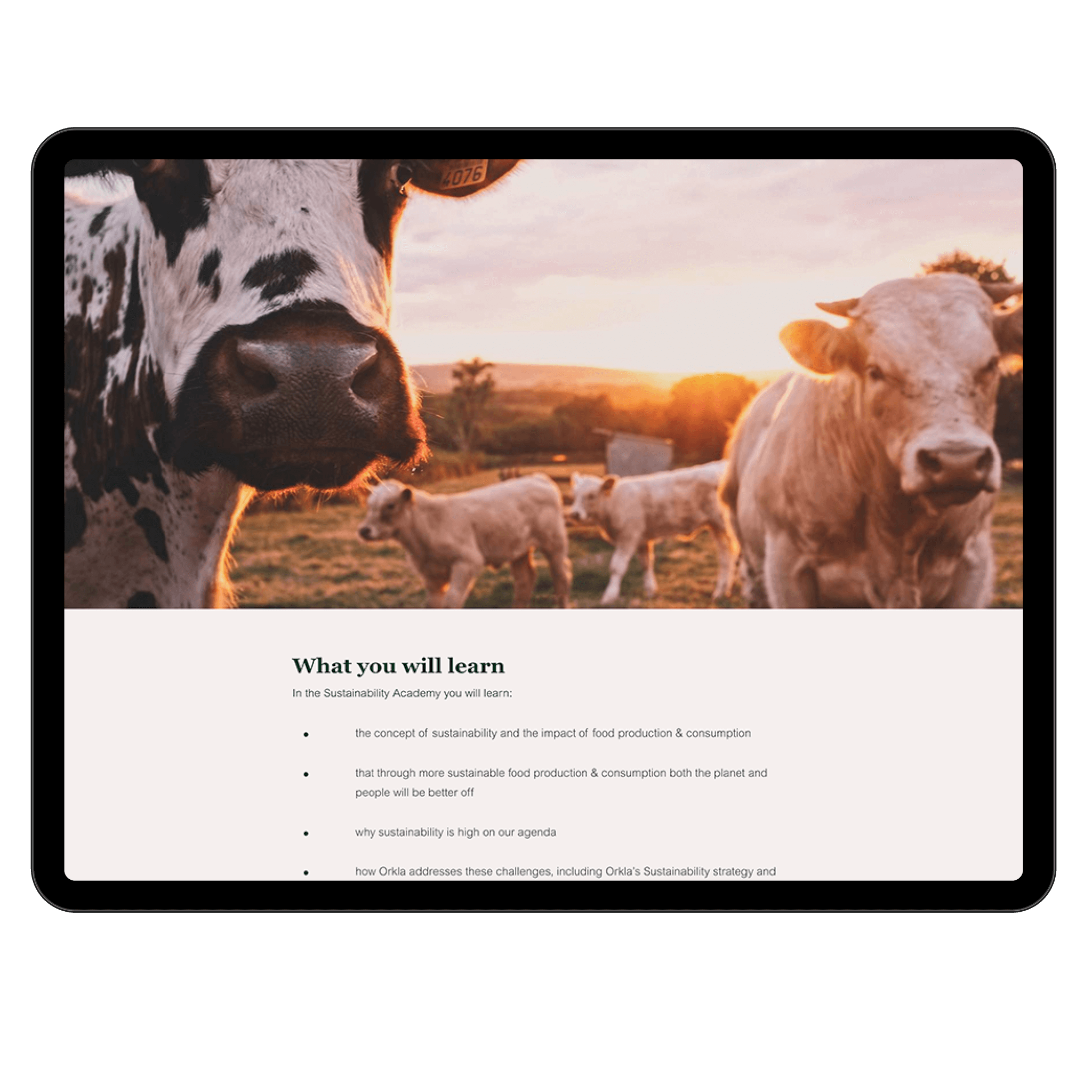 Lösningen blev Orkla Sustainability Academy. En ambitiös, 20 timmar lång digital utbildning där vi bryter ned grunderna i hållbarhet både koncept, utmaningar och lösningar. Akademin bidrar med kunskap och verktyg för att alla på Orkla ska kunna jobba med hållbarhet i sin vardag och för Orkla skall kunna nå sina mål.