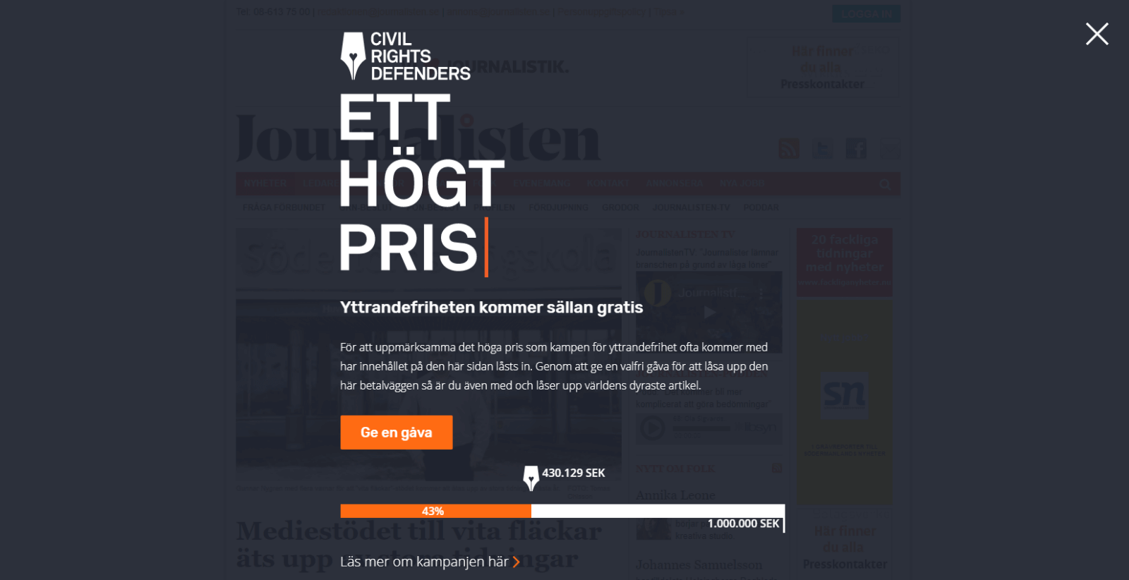 Yttrandefriheten är hotad över hela världen och journalister betalar det mycket högt priset av personlig säkerhet för det fria ordet. Genom att skapa världens dyraste betalvägg hjälpte vi Civil Right Defenders att samla in pengar och få ökat stöd.